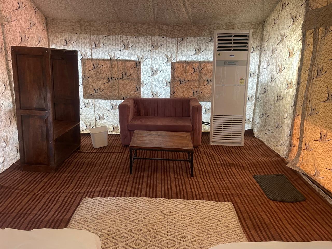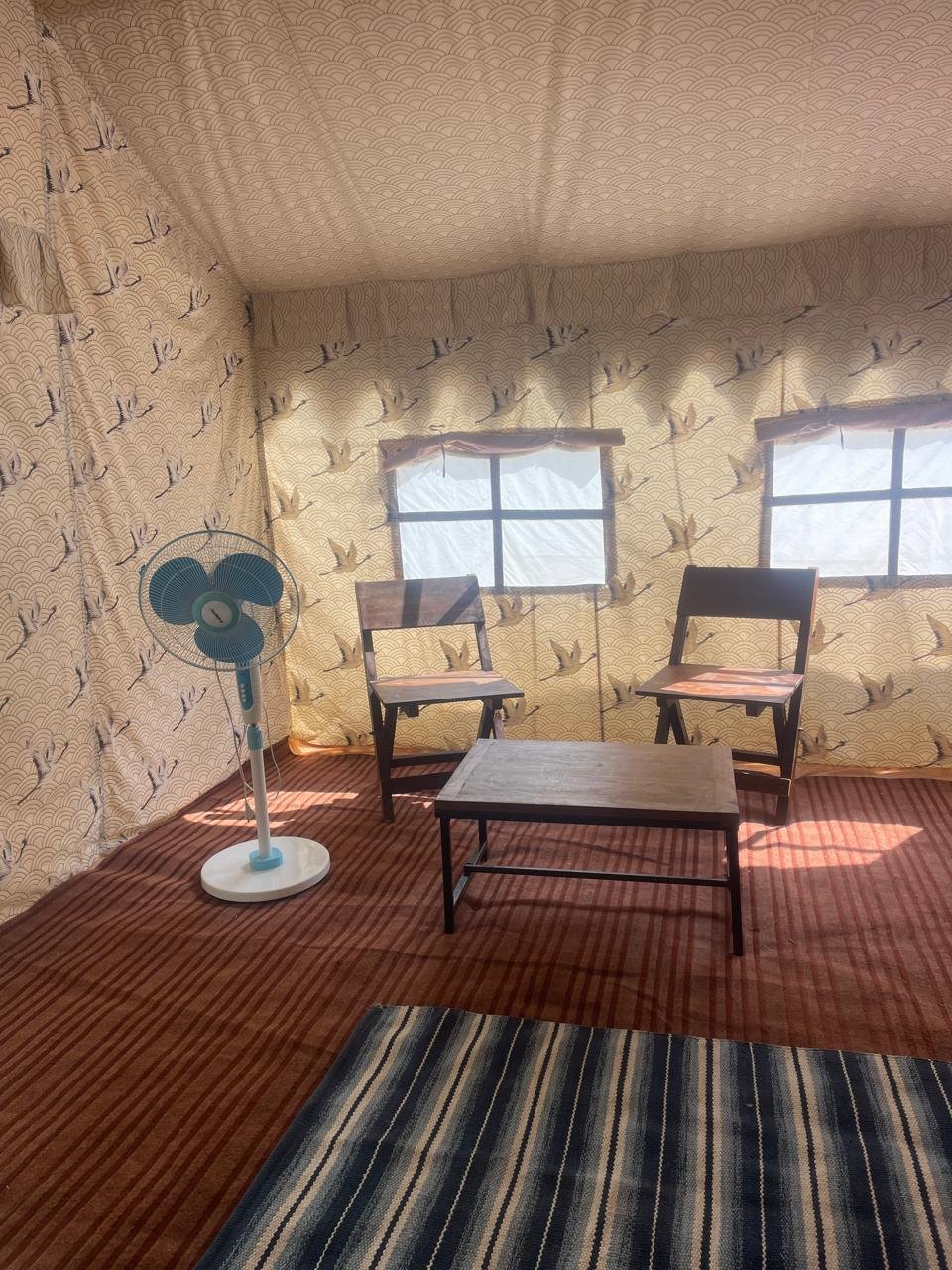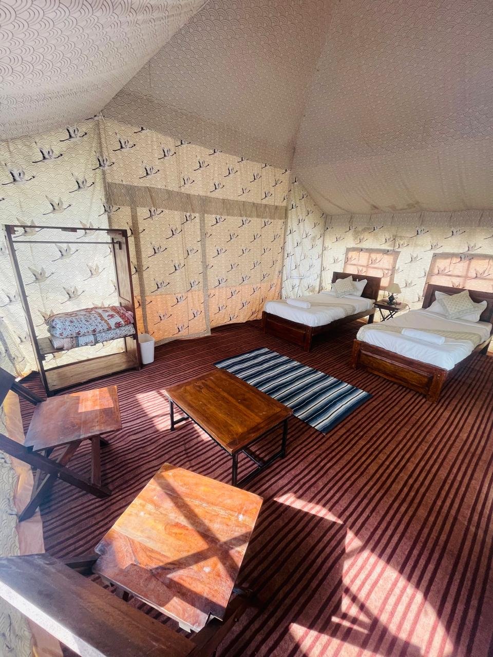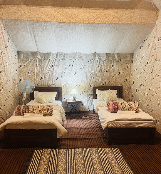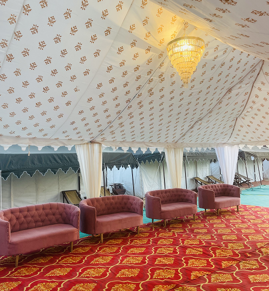 The Maharaja Tent is thoughtfully designed for comfort and style, featuring two single beds complete with mattresses, quilts, bed runners, and pillows. The interior includes two lamp tables, two chairs, a coffee table, almirah, mirror with frame, pedestal fan, carpet, and foot mat—all arranged to create a cozy, inviting space.