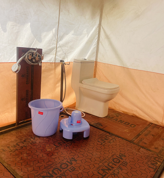 Spanning 18 × 22 ft, the tent offers ample room to relax, with a 5 × 18 ft balcony that extends into a private sit-out furnished with two resting chairs and a table. The 5 × 10 ft bathroom includes a western toilet, shower with tub and mug, towels, and essential toiletries such as sanitary napkins for added convenience.
